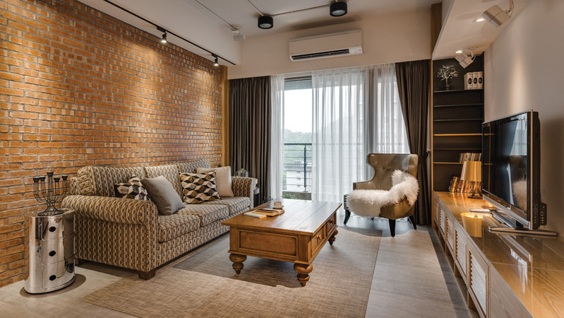 窗外即是蒼翠山林的景致,為明亮而舒適的客廳,帶來無與倫比的放鬆、休閒感,特別是加高的電視檯櫃設計,結合低檯機櫃與坐榻、收納等多重機能,並對應樑下加長的板塊與側向直立層板櫃,構築完整的主題面,賦予空間和諧的視覺比例。
