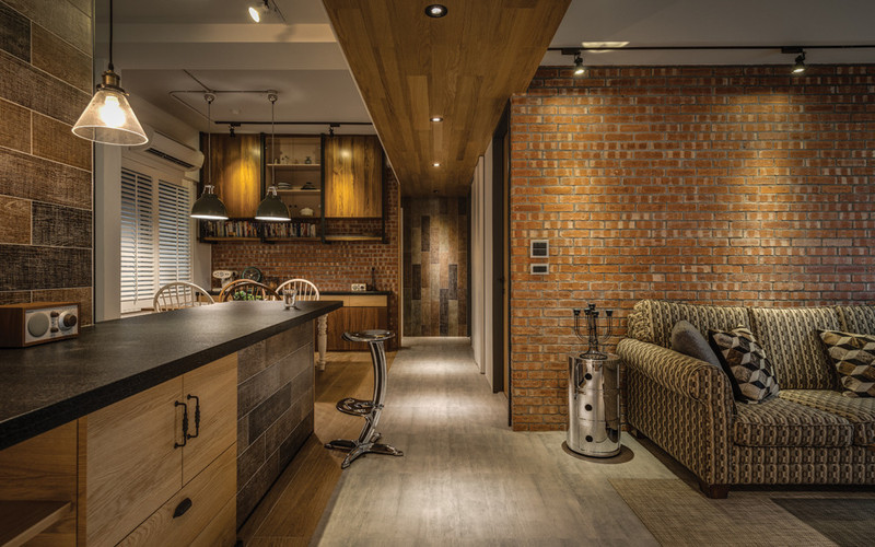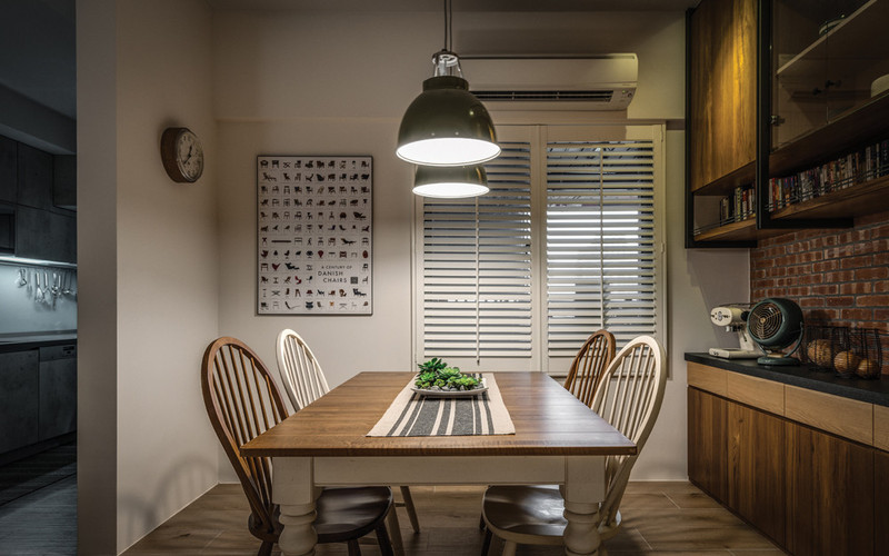 巧緻餐廳座落安定角落,面外窗加裝白色木百葉,營造唯美的情境效果,餐桌後靠以溫潤木質搭配鐵件骨架施作分段餐櫃,背景的紅磚語彙錦上添花,描繪異材質混搭的多變趣味。