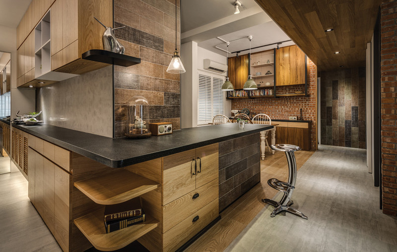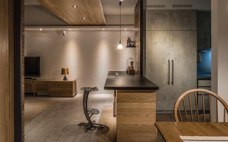 原格局玄關礙於廚房隔間的限制,不僅缺乏必要的收納空間,連視覺也相當壓迫,於是設計師移除部份廚房實牆,並善用剩下的牆體打造一座三面可用、且具備不同美感的複合式機能量體,為使用者提供多采多姿的生活樂趣,包括玄關進門處整排的上下櫃設計,主體溫暖的木質底蘊釋放「歡迎回家」的歸屬感,刻意分段的佈局微妙消除櫃體壓迫,而上櫃俐落的線條分割間嵌入藍底白格子,賦予造型活潑變化,下櫃左半搭配百葉門片好作為鞋櫃使用,底部留空後襯燈光的技巧,同樣能讓量體輕盈化,腰段檯面背牆選用手工馬萊漆塗裝,燈光下斑駁漸層的銀灰色光澤,大大提升細節的精緻感。順著櫃牆轉進客廳,設計師藉著腰段檯面九十度延伸,打造出精緻的餐檯機能,最特別的是上櫃邊緣也加作一段小巧展示檯,巧妙銜接兩個造型面,此外,地坪的部份也對應過道上方的木質板塊,利用灰色地磚與木紋磚的差異色彩為機能屬性劃界,原先侷促又封閉的視野,變身為超乎想像的行雲流水!