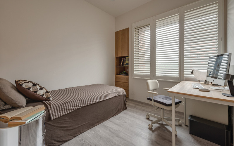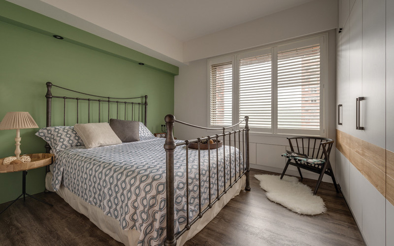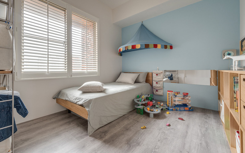 清爽的主臥室以美麗的灰草綠為床頭上色,內退的梯階層次同時巧妙緩解樑的壓迫,床下與床尾區域都有大容量的收納設計,而天空藍入鏡的小孩房也兼遊戲室,明朗純淨的空間感,最適合陪伴孩子開心成長。