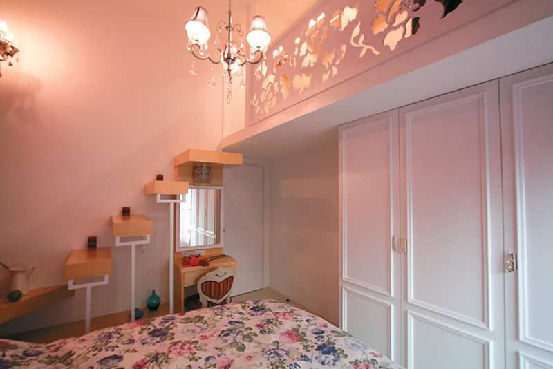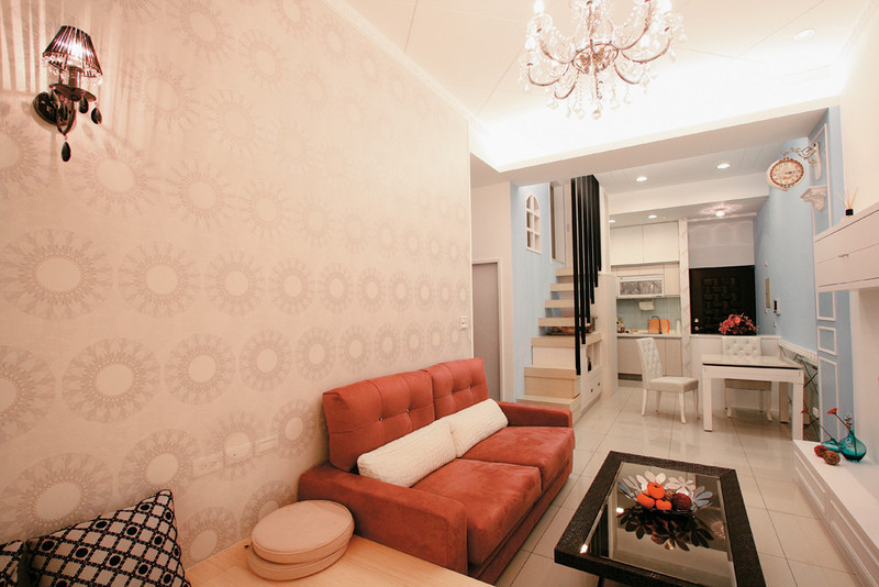 客廳的天花板,以及餐廳牆面使用的鏡面玻璃,都以菱形的紋飾呈現,相互輝映出寬敞明亮又具層次的空間感;而不論是金碧輝煌的水晶吊燈,或者是展現浪漫風情的精緻壁燈,在提供照明的基本功能外,更形成光影交錯的視覺效果,替空間層次添更多變化的躍動感,在清淺的空間裡,注入更具活力的豐富表情。