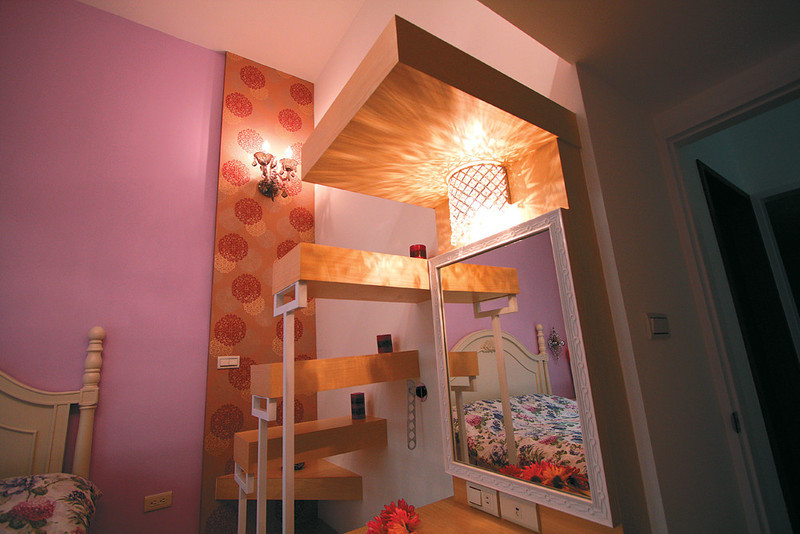 利用粉刷與壁紙的素材差異,讓功能性不同的客餐廳有了區隔,也彰顯不同空間的個性,平常只有姊妹兩一起生活,但常有朋友來訪,因此用餐空間規劃了可彈性伸縮的餐桌,可依情況加大用餐桌面;落地窗前的架高平台,附帶了收納功能,可升降的桌面,不管是接待朋友用餐或者留宿,都有了更多元的變化。設計師更巧妙的將階梯底下的空間規劃成櫥櫃,增大收納功能外,更可擺放電鍋、微波爐等電器,擴充餐廚空間。