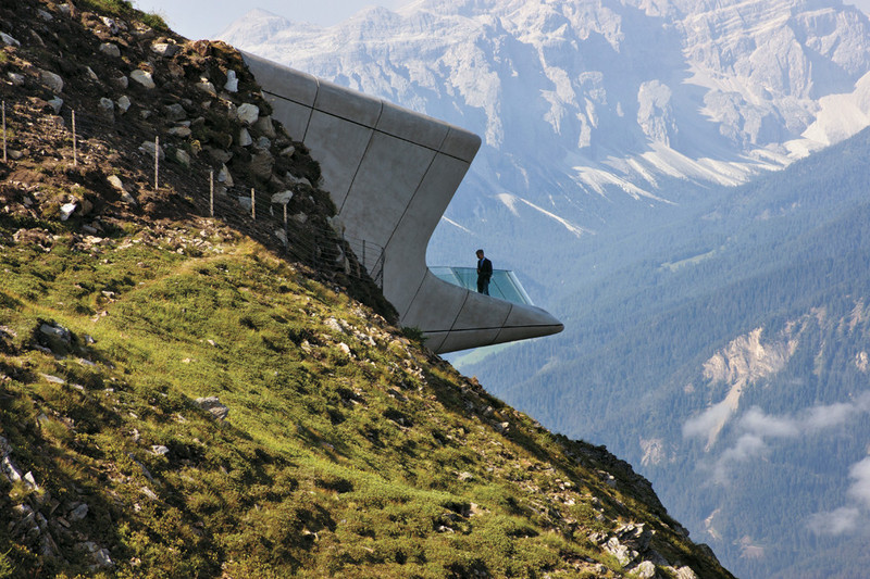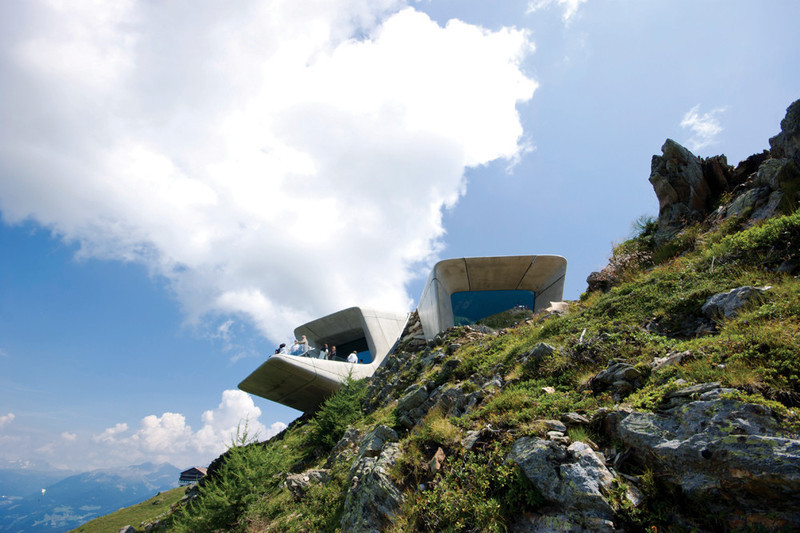 環視整個建築物的外觀,可以發現整棟建築物並非矗立於山頂上,而是自一個崖壁旁像觸角一樣從地表竄升而出,內部規劃了總共三層的展覽廳,展示了Reinhold Messner歷年來的圖像與文字記錄,以及曾經使用過的工具,三個樓層以像山澗飛瀑般的壯觀手扶梯連接,從崖壁延伸而出的三座觀景台,其中有兩個擁有觀景窗,讓參觀者可以遠眺Peitlerkofel 與Heiligkreuzkofel山,另外一個則是可以讓參觀者自由走到室外的開放式陽台,親自感受阿爾卑斯山巒壯麗綿延的動人景色。