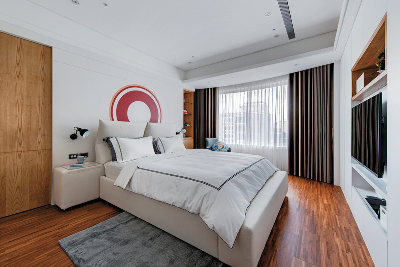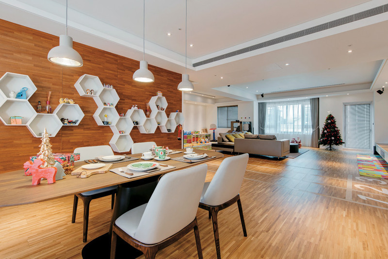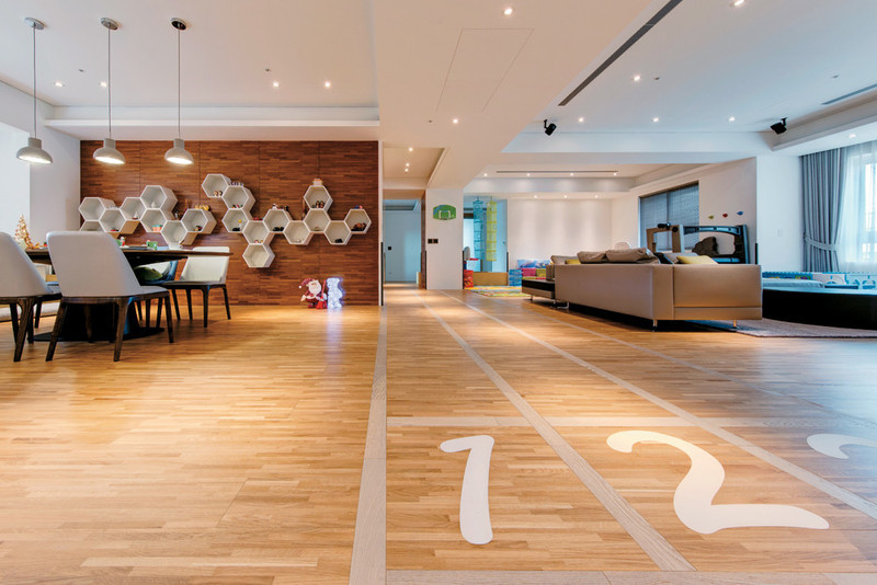 公領域地面滿鋪舒適木地板,為了迎合熱愛運動的新手爸媽,設計師特地在玄關進門後;客、餐廳之間的地坪鑲嵌跑道線條,令人玩心大起的同時,也牽引視覺、動線向四方開展。考慮未來還會有新成員加入,客廳沙發後方的開放遊戲區,已經事先預留所有必要管線與空調,只需隔間成形即可回復房間使用,最特別的是:包含現有的兩間或未來新增的小孩房,屋主要求舉凡室內坪數、所用建材、機能設備都要一模一樣以示公平,這可讓設計師在平面規劃與線路配置時傷透腦筋呢,不過最終還是完美的使命必達!