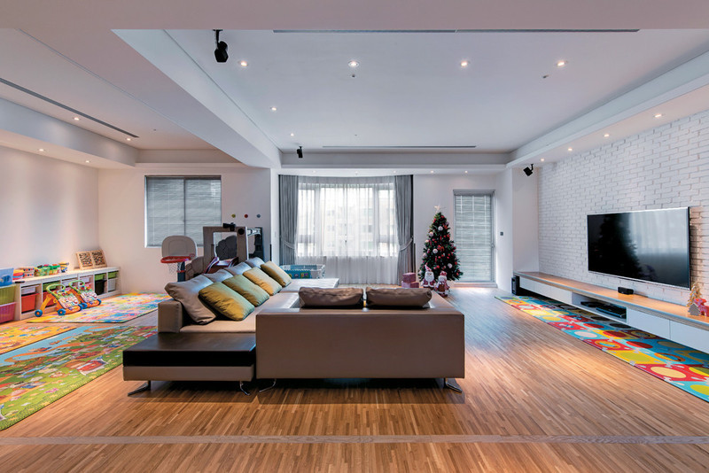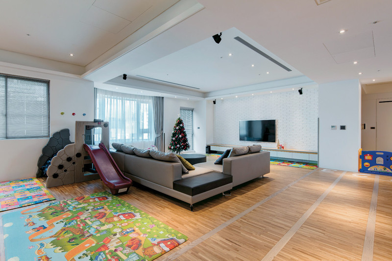 全案室內坪數廣達70餘坪,但熱愛運動、陽光的新手爸媽,希望讓剛學步的一雙寶貝,可以在安全、舒適又寬敞的空間內盡情嬉戲、奔跑,於是除了主臥室和兩間小孩房、三衛浴之外,其餘空間儘可能開放處理,釋出最佳化的活動版圖,讓整個家就像一座私人遊樂場!