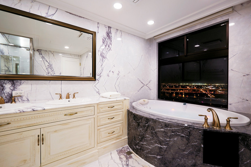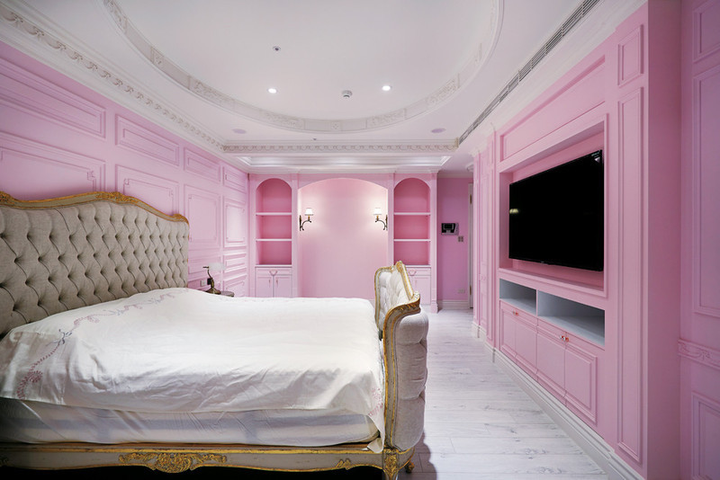 三間房都擁有精品旅店等級的全套房配置,其中寬敞主臥室是全案夢幻特質的延續,睡眠區周邊的古典造型,全撒上一片粉色的浪漫,與清爽的木地板共譜輕盈且和諧的休憩氛圍,附屬的更衣室機能強大,比美巨星攝影棚的梳妝區,極致奢華的主浴室尤其精彩,外殼以大理石雕鑄的橢圓浴缸,就設置在景色絕美的窗邊,整間浴室皆使用純銅五金,加上大尺度的雙人大理石洗手檯、刷舊處理的復古風浴櫃彰顯細節的盡善盡美。