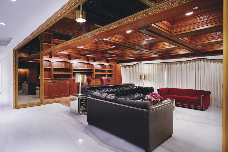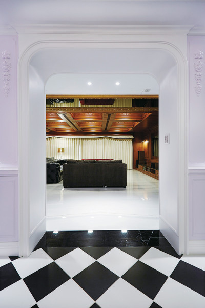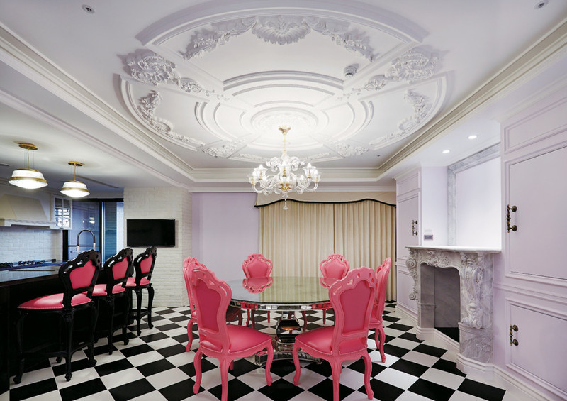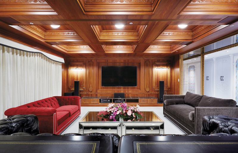 順著廊道前行,進入精工雕琢的大器客廳,使用大量木質、古典線板與多重繁複工序,精心打造九宮格天花板與散發思古幽情的電視牆造型,馨暖厚實的木頭質感,映襯浮雕於層次細節的浪漫圖案,廳內大膽擺設黑、鐵灰、紅三張國外代購的精品沙發,帶出沈穩和諧的中軸線,為了滿足高規的聲光娛樂需求,現場並內建9.1聲道音響,整體無可挑剔的工藝之美和完善機能,引領感官盡情享受宛如置身英倫古堡般的情境張力。