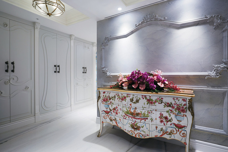 一進門的玄關區非常寬敞,廊道左側規劃一字排開的置鞋高櫃,滿足女主人的大量鞋類收藏,三等分的列柱量體採內嵌設計,並以設計師手繪、訂製的實木線板詮釋外觀,與眾不同的藝術性不言而喻。