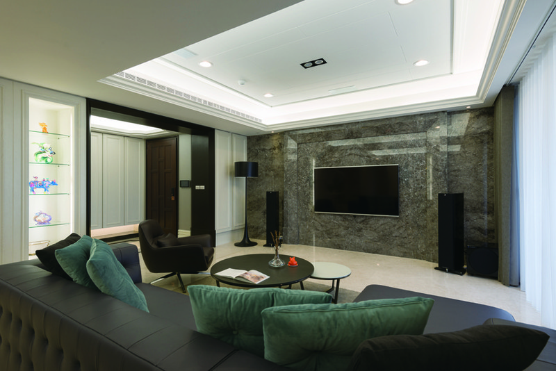穿過玄關開口的深木色拱門即為客廳,豐沛的光感因為白色基調而更顯溫馨。客廳裡全幅以天然石材打造的電視牆沈穩大器,自左側展示櫃一路延展至窗邊的大面寬,有種一氣呵成的暢快淋漓,設計者並在壁掛周邊加諸古典邊框的立體造型,表現獨一無二的細節工藝。
