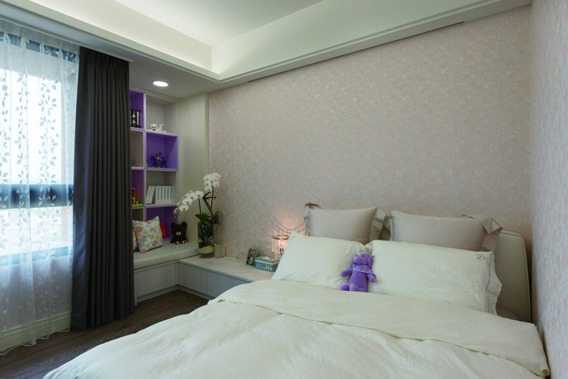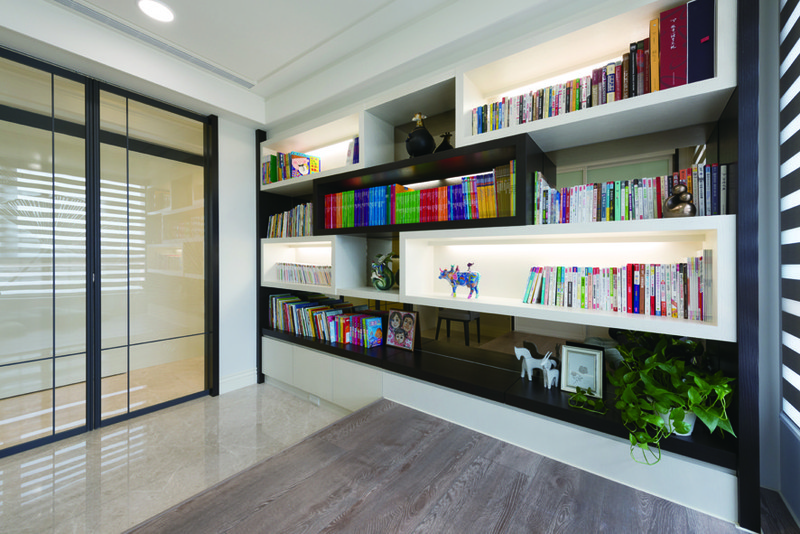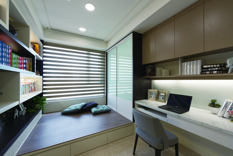 串連公私領域的中央走道刻意放大,壁面則採用白色烤漆造型板,讓明亮淨白的材質提升視覺開闊感,而廊道間善用隔牆退縮互補增設的大型收納櫃,為居家提供大容量的收納空間。書房座落廊道前緣,機能上設定為多用途空間,包括前半部當作男主人的事務室,後段架高的木地板則成了小朋友的遊戲區,衣櫃搭配烤漆玻璃門片,兼具親子塗鴉牆的趣味,亦能當成客房、孝親房使用,入口對開的拉門巧妙截短走道,而室內採大地色系為主題,讓空間用途的轉移不著痕跡。