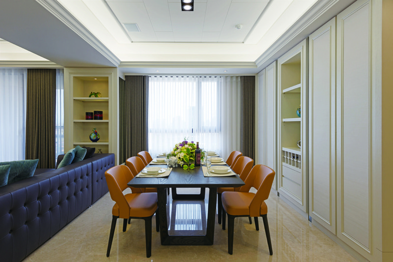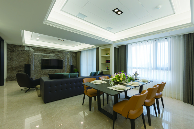 長沙發後方的區域規劃餐廳,可容納6-8人共餐的長桌居中,還有獨享的窗景為美食增色。光潔的廚房隔著走道、機能餐檯與餐廳相望,白色鋼烤櫥櫃、白烤玻璃加上人造石餐檯,共構無可挑剔的現代美感,而完善的廚用設備,更讓做菜過程成為一種享受,讓家人得以在最輕鬆的情境中同享歡樂時光。