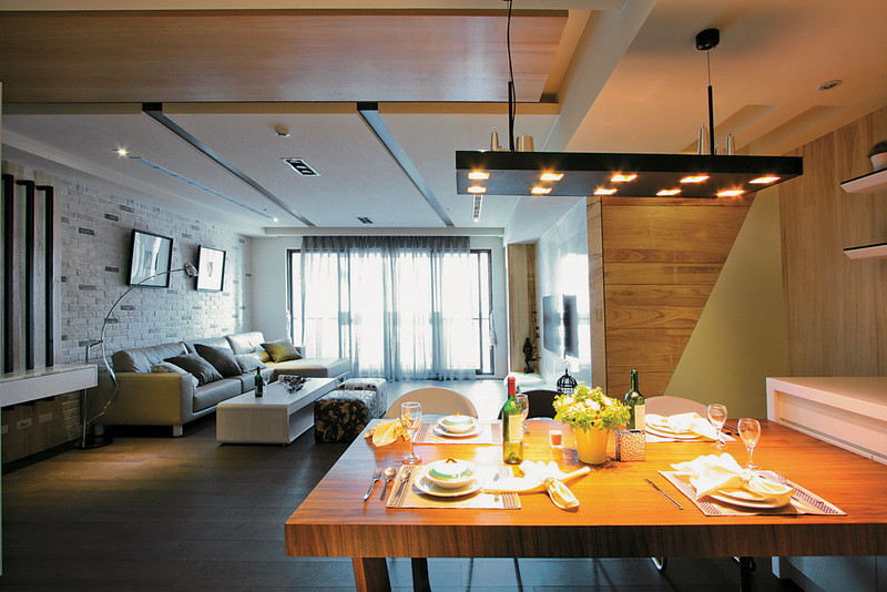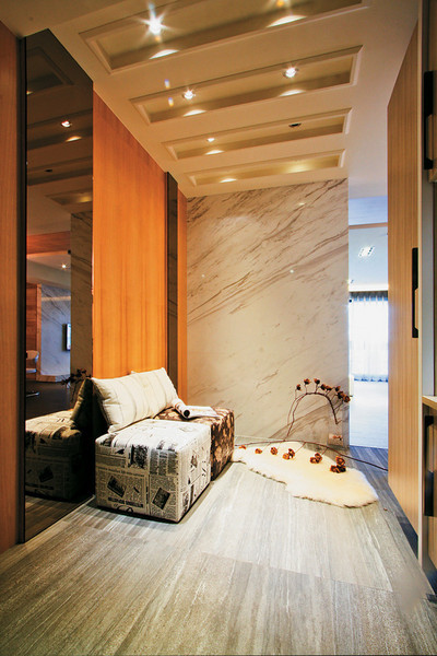 個案本身座落於台中市,在預售屋時即商請墨比雅設計團隊為其進行客變規劃。屋主長年在大陸經商,表示房子是後要交到兒子手上,所以在顏色、格局的配置上,參與孩子希望的機能與風格方向,公共空間以自然調性為主,安排具自然紋理的媒材,如:梧桐風化木;男孩房則以時尚語彙鋪陳,強調個性主張。玄關區域透過櫃體安排出收納、展示機能相互對稱的空間環境,光氛與媒材紋理的協調調性,底端立面利用雪白銀狐、休閒意味濃郁的布質椅凳,延伸自然悠閒的意象。餐廳區域以梧桐風化木為空間主題的衍生,透過紋理與間接光源安排出天花造型,引申舒適餐敘氛圍。客廳區域主牆以銀狐大理石為主,凸顯大器時尚,與沙發後方文化石主牆的質樸表情,形成前後對應旨趣,天花以線條造型表現,發展視覺延伸的張力。