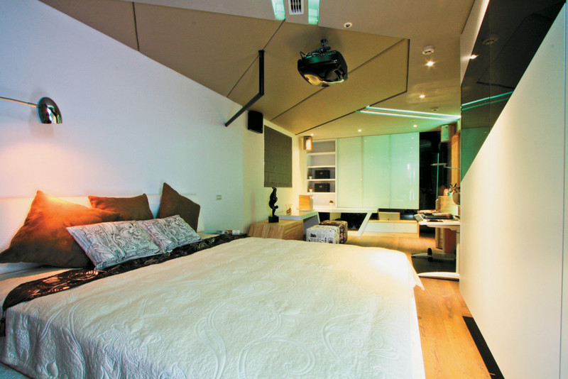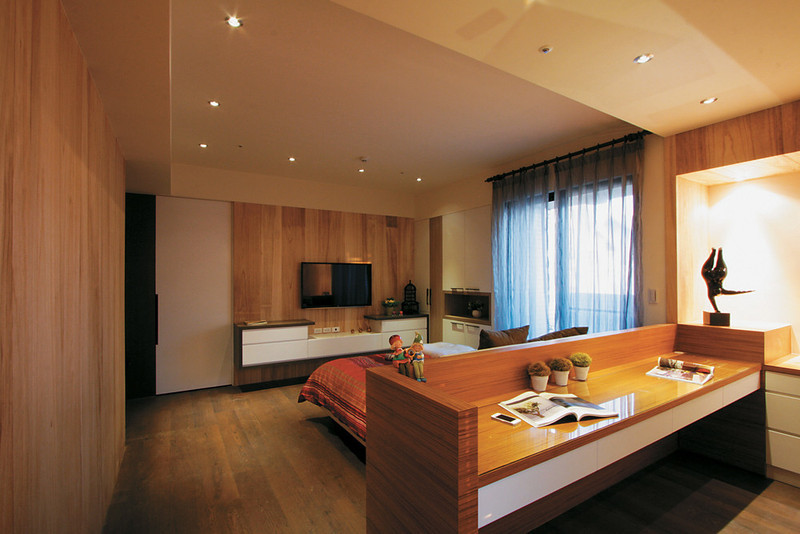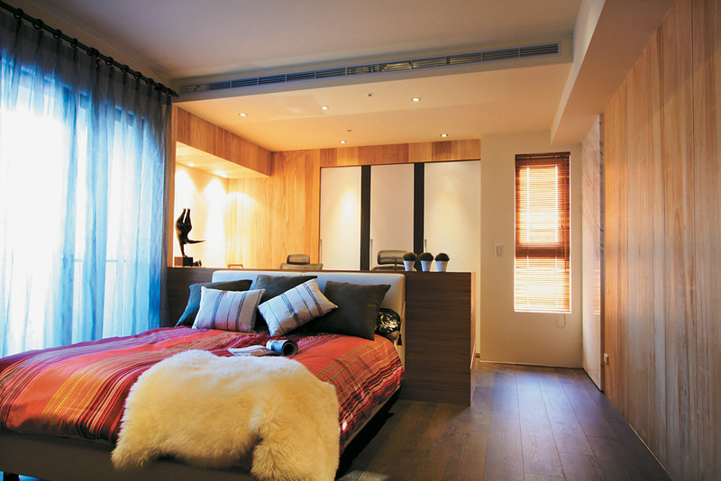 走道利用梧桐風化木與木作造型形成幾何圖形關係,並延伸至私密空間,成為主要的立面或天花造型的發展主題。男孩房規劃上以時尚語彙為主,在造型、材質上均積極的將美學與機能做出平衡而細膩的結合,天花以皮革做出幾何造型包覆質感,更將視聽空間的使用機能設計於其中,顯出空間的時尚質感。主臥的規劃上,以梧桐風化木為主,延續公共空間的自然精神。在床頭後方規劃男主人的辦公空間,方便其往返兩岸三地時,可在此處理公事,也可以得到放鬆的休憩時光。由於屋主十分在意甲醛的味道,因此在塗料、媒材的使用上,皆採用不含甲醛的為主。墨比雅設計團隊本著對於創意的細膩及獨特專精的品味,以自然溫婉的手法及單純深淺並蓄的設色,巧妙地鋪排出居住者對於家的渴望與感動。