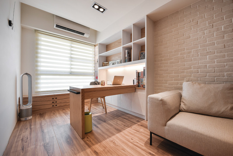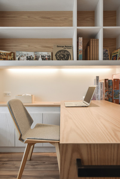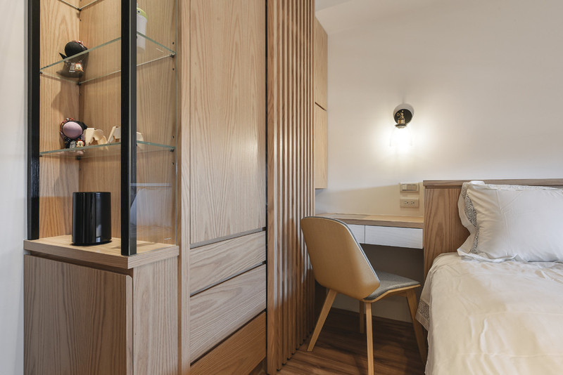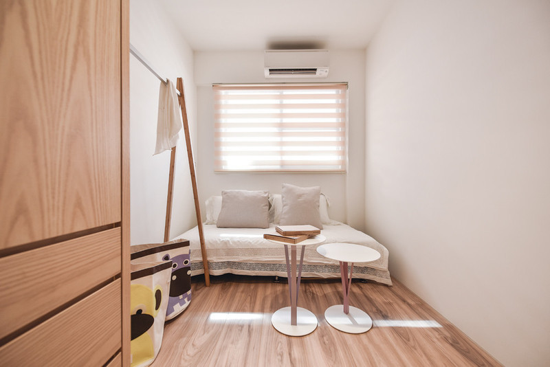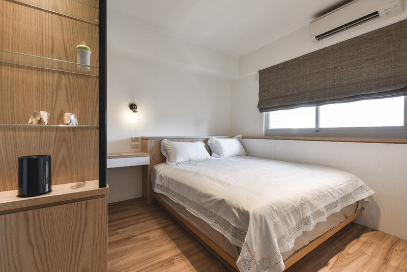 這麼小的空間還要各種生活項目一應俱全,勢必在機能形式上要有所變通,而原始屋況的缺點之一,就是沒有可以擺放餐桌的空間,所以設計師善用窗邊開放閱讀區的位置,量身訂製了單足附軌道、可輕易前後滑動的多功能桌,賦予它兼具風格餐廳的複合彈性,當人多的時候,可以將書桌移動靠窗,配合窗下的收納坐踏,就算多人共餐也不成問題,活動桌側面靠牆打造成附燈光的展示櫃,可延伸的檯面非常實用,除了餐廳、閱讀區之外,這裡同時也是舒適的工作站。主臥室大致延續公領域的清新簡約調性,考量床頭有大樑橫過,為了化解壓樑禁忌,特地設計了上掀收納腰櫃增加儲物效益,檯面並在轉折後於窗下延展,拉出和緩的空間面寬,床左側設置梳妝區,衣物櫃採別緻的兩面設計,最棒的是面床的櫃門,在梳妝區旁改為格柵拉門處理,省略操作半徑的巧思,為小空間的大舒適明確定義!