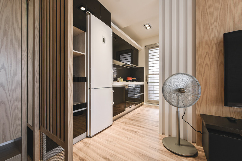 從大門一進來,充沛的光感迎面而來,小巧的玄關利用一扇可收進櫃側的兩片式連軌屏風界定。這扇屏風下緣裝設個性十足的鐵網材,維持視線有限度的穿透,其中一片融入格柵線條,另一片面大門貼上明鏡,兼作活動的穿衣鏡便於整理服儀,整體精緻實用且不佔空間,更能適度屏障進門直貫廚房與工作陽台的視線。屏風兩側也是全案相當重要的收納區塊,分左右貼牆規劃玄關鞋櫃與家電櫃,其中木質鞋櫃樣式簡潔,天然木紋賦予櫃體和煦溫度,俐落的幾何分割展現設計品味。屏風與冰箱間則安排時髦家電櫃,與廚具一氣呵成的黑色結晶鋼烤外觀,讓小巧廚房洋溢時尚感,專職儲放屋主夫妻為了舒適新婚生活,精心選購的多款電器產品,設計師在每層格櫃內皆備有專屬電路插槽,體貼設想面面俱到。