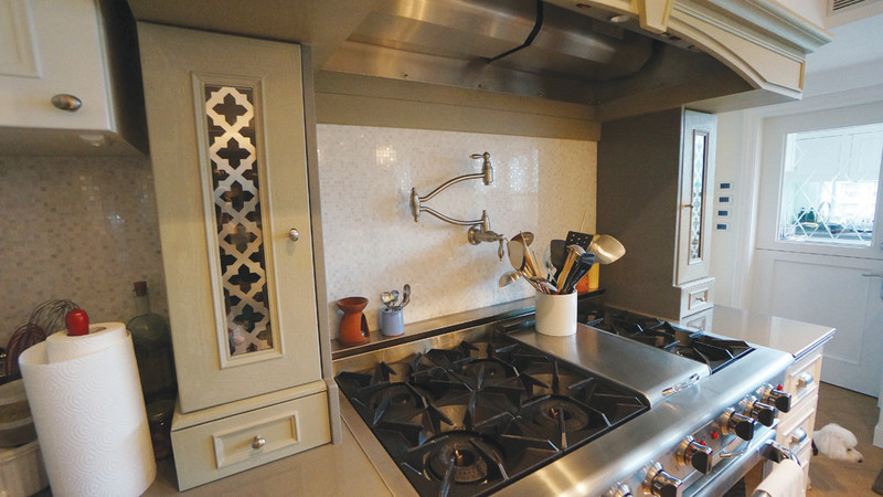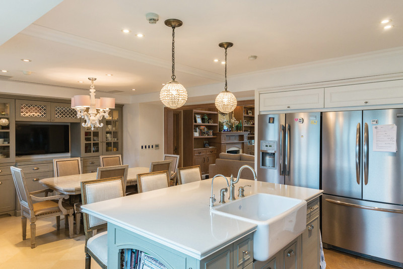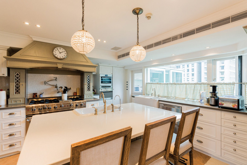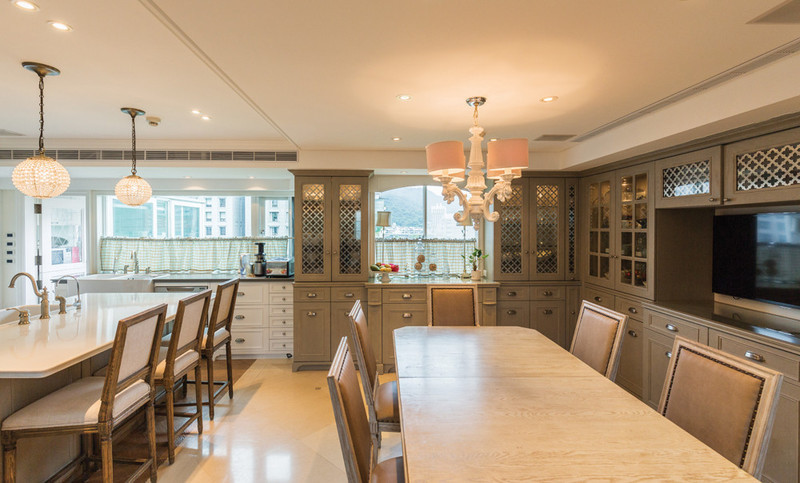 開放規劃的餐廚區,堪稱整個屋子裡使用頻率最高的機能場域,除了以特製機能中島、六人份長餐桌為主的機能軸線,周邊也依使用者習慣,逐一定位包括兩台三門大冰箱、六口爐外加烤盤、爐下大烤箱、商用吸油煙設備、專屬淨水供應系統等同步整合的烹調熱區,以及內建強大功能的精美櫥櫃,徹底顛覆國人已知的廚房內容。