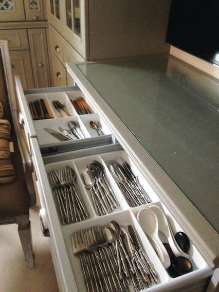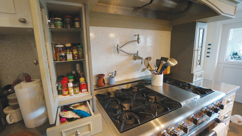此外,餐廚區周邊局部鑲嵌金屬雕花飾板或玻璃的漂亮櫥櫃,也分別融入許多不同用途的機能巧思,例如壁掛電視的這一整座櫃體,設計師於腰段內崁滑軌拉抽板,當三段檯面全拉出時,等於多了一座實用的Buffet檯,非常適用於多人聚會的場合,而櫃體間另有多處窄拉櫃的設計,分別用來儲放琳琅滿目的調味料與家常保健藥品,分類設計的項目之精之細,著實令人歎為觀止!