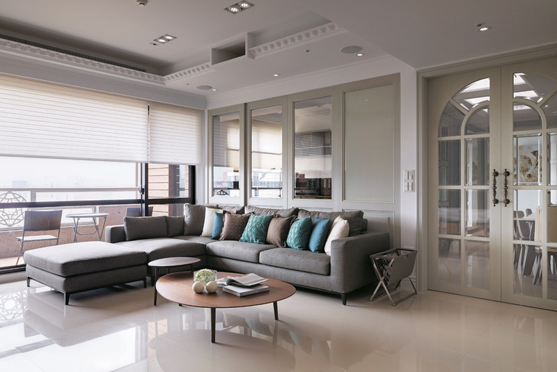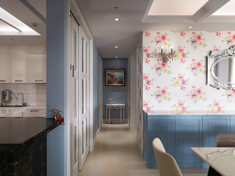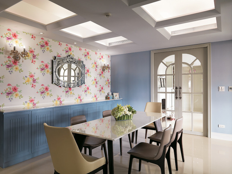 於沙發後方雙開式推拉門扉的設計,寓意女主人希冀的柔美鄉村風格的起始…經典的藍色融合花卉語彙的壁紙材質,搭配流明天花的設計,有效的拉高空間高度,也挹注柔美典雅的氛圍意趣。