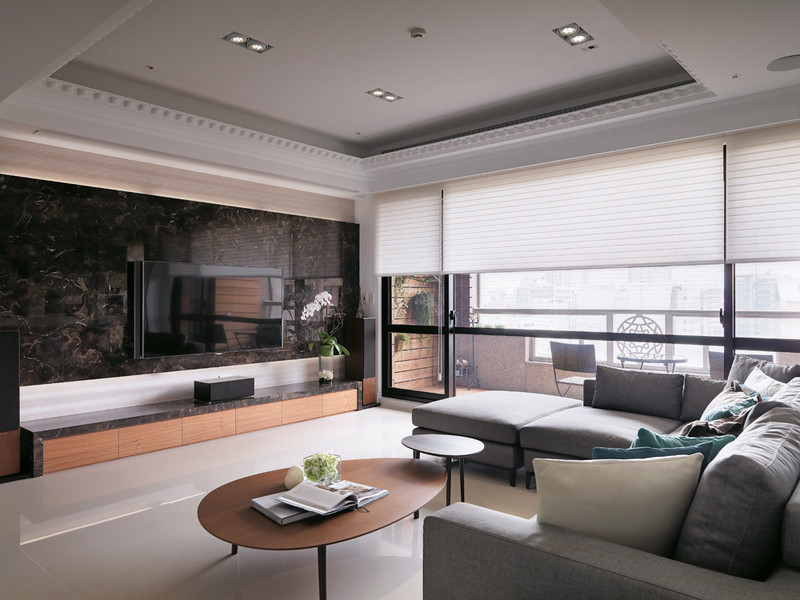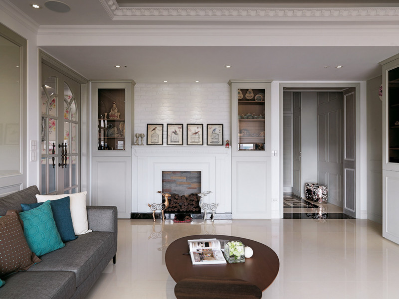 玄關透過鏡面材質、大理石拼花,完美的比例線面表情,引申新古典的生活底蘊。客廳空間以男主人希冀的新古典風格為主,唯減少線條及過多的裝飾性材質,一旁仿製壁爐式的主牆面,對稱的表情形塑出空間完美焦點所在。