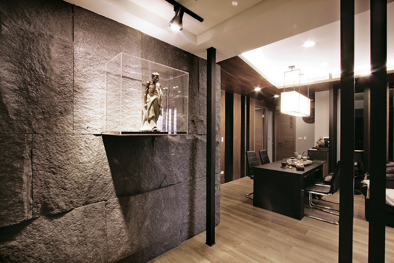 於玄關第一眼光即被石皮牆上的達摩藝品雕刻張力所深深吸引…
