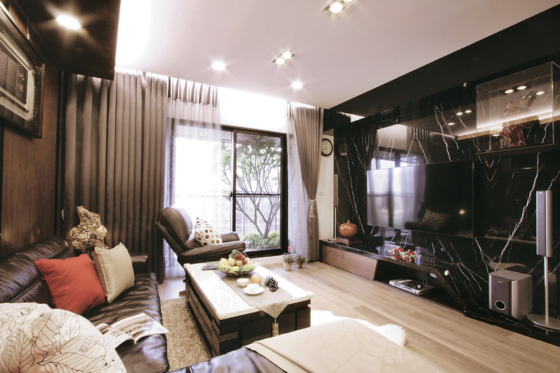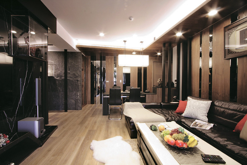 客廳空間主牆採用與黑色鏡面呼應的黑雲石材,天然的黑色基調與白色對比的紋路加上嵌入厚度8MM鐵件層架,置入關公的精雕藝術品的恢弘氣勢。沙發背牆使用天然山形脈絡的實木,搭配設計師堅持以手染工法顯現木紋紋理,並使用不同尺寸黑色烤漆鏡面玻璃點綴,對比分割,圍塑品味與意境上的臻美,同時讓空間坪效放大且具層次、活潑意趣。