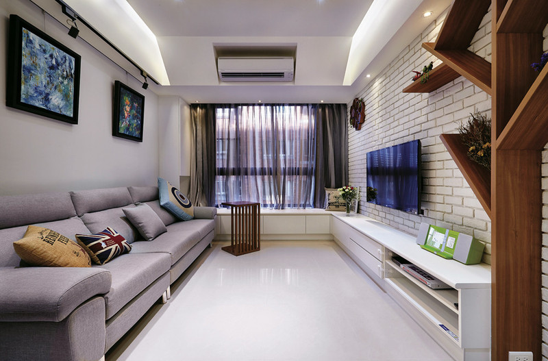 以系統層板構築成的樹狀展示架,替客廳的白色文化石電視牆錦上添花,不僅與綠色烤漆玻璃相呼應,豐富了森林系的自然空間表情;與電視櫃連成L型的矮櫃,在收納之餘,更具備了可坐可擺放展示品的功能,減少客廳的座椅數量,並以格柵式的優渥邊几取代壓迫感較重的大茶几,讓空間更為寬敞。