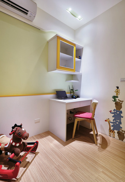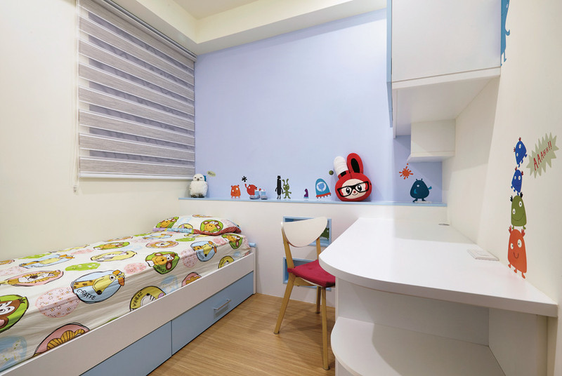 藍色房為兒童房,由於空間相當有限,因此除了床頭閃樑的規劃外,運用衣櫃結合床箱的方式,讓床與衣櫃互相結合,增加擺放衣物的抽屜;書桌上設計成導圓角,避免孩子碰撞受傷,讓活動力強的孩子安全無虞父母也安心住得更有趣味。