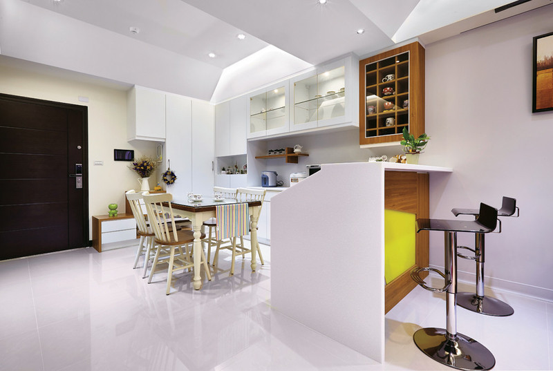 這是一個很適合小家庭的格局,在不算大的空間裡,五臟俱全擁有一氣呵成的客餐廳,以及各種實用機能都具備的餐櫥、收納空間。由於女主人希望家中能夠多一些展示的空間,並在設計中加入藝術的概念,因此利用了一些畸零的空間,化零為整,滿足了展示收納的需求;更選用了不同的色彩,定調空間特性。