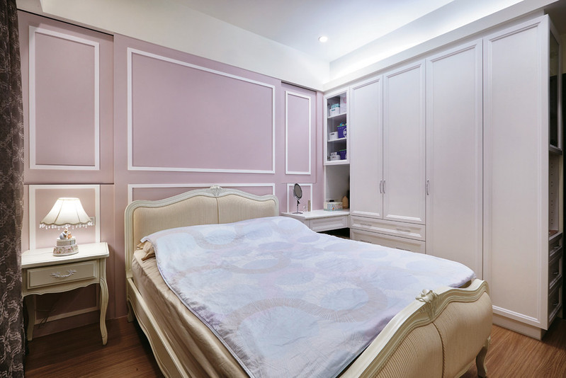 在粉色系的主臥室裡,也能看得見用心與貼心的規劃,利用推拉門的設計,完成床頭背牆,不僅遮蔽牆上的兩扇窗戶,消弭了堪輿上的忌諱,也使得床頭背牆更有層次感。衣櫃的櫃門,也選擇了鋁框邊的材質,呈現立體感的同時,也更映襯櫃門上飾條的風格。