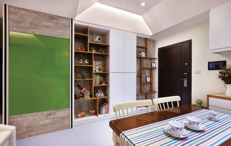 以大面積的白、灰色,搭配局部柚木色及綠色,在客餐廳營造出極富森林系療癒功能的自然氛圍,並善用系統傢俱層板尺寸多樣化的特性,利用不同深淺的層板,結合開放式層架及封閉式櫥櫃,將大門入口處原本有凹有凸的牆面,打造成女主人指定的展示收納櫃。由於家裡的孩童正是處於對事物感到好奇的階段,喜歡塗塗畫畫,而這具磁性的綠色烤漆塗鴉牆,不僅可以供小孩塗鴉,也可輕易擦拭,並兼具留言板多重功能,讓這一面牆,成為一進門之後的第一個亮點。