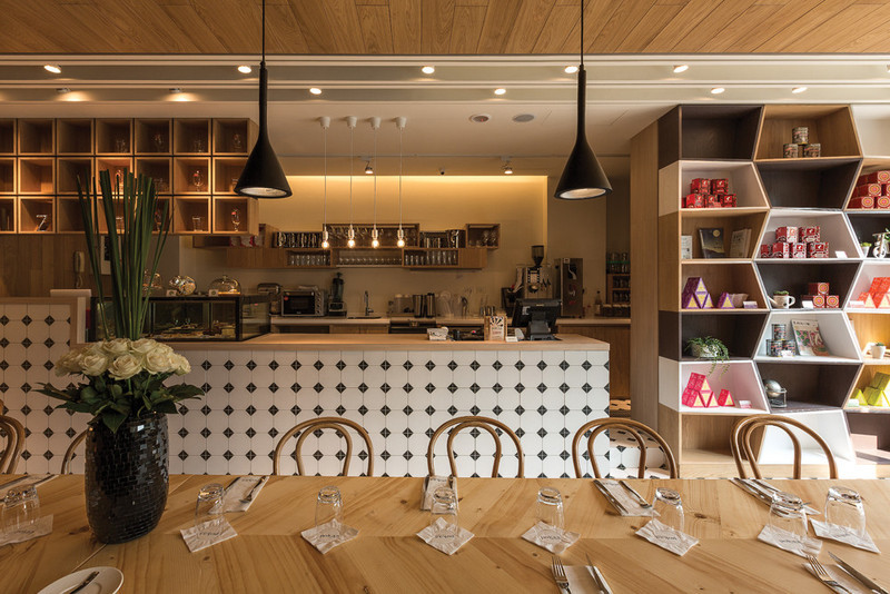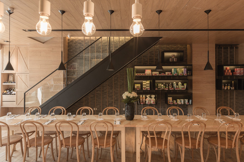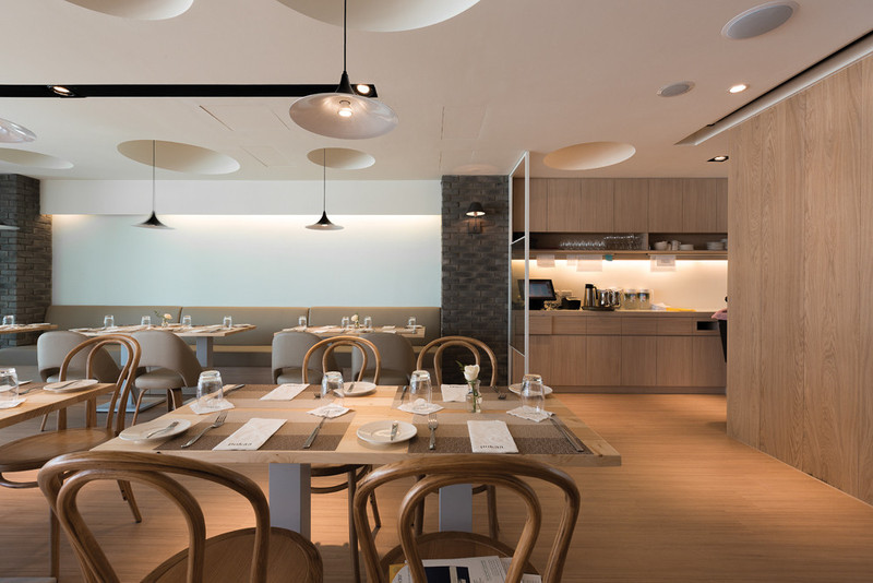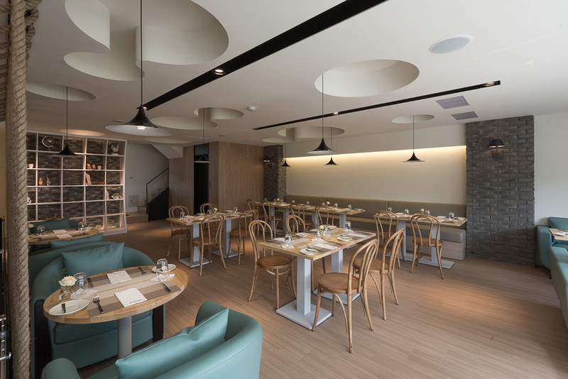 二樓座位區,考量一般來店用餐人數多為兩人或以上,因此在客座分配上,採兩人以上的偶數安排,並訂製店家定為Logo色的藍綠系沙發,搭配木製餐椅與卡其灰色皮面卡座,好因應不同用餐群組的需求。面外大面開窗引入豐沛光線,在這裡有兩處座位最為特殊,其一可獨享大小兩圈潛望鏡,另一側角落則受益建築逐層退縮,設計師順勢規劃為造型別緻的採光天井,當冬日暖暖的陽光撒下來,常有人一下午都不捨離開呢!