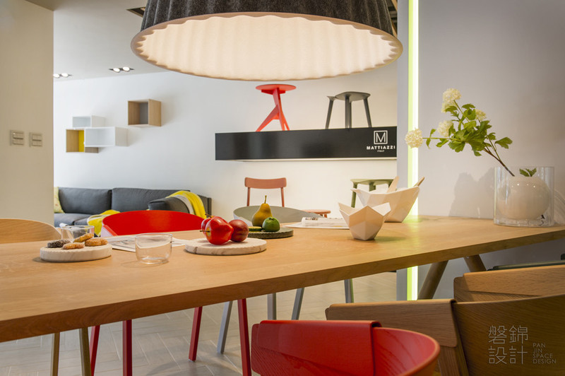 而柱子部份刻意以包覆的方式,將無法避免的大柱子轉個角度,加上色彩與條燈的跳色方式,消弭了柱子的厚重壓迫,在背景光的烘托下,架上的書籍、家飾品各有姿態,勾勒出另一種視覺端景,也讓空間更加活潑。