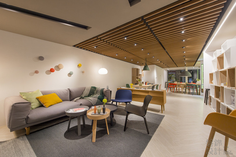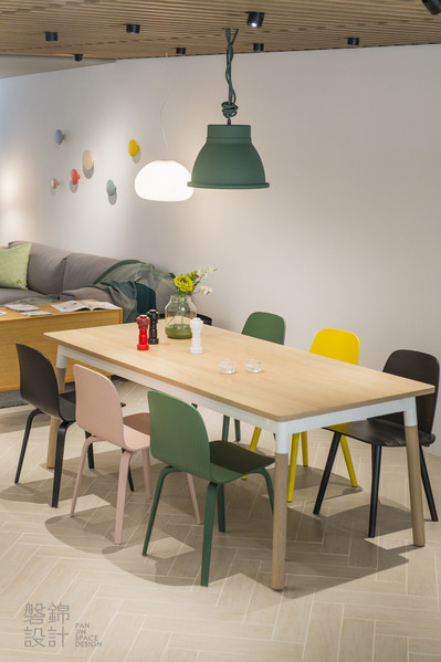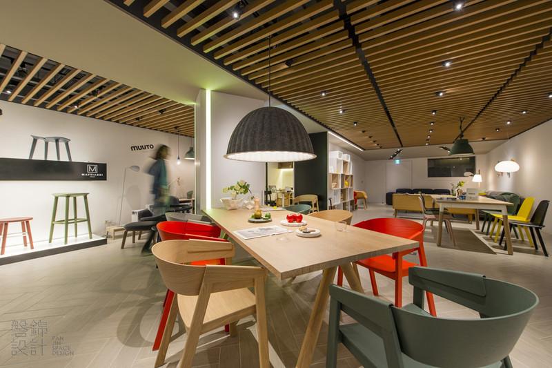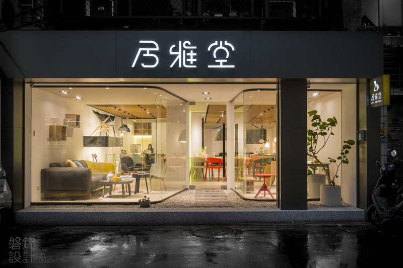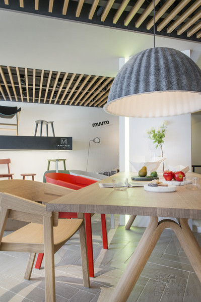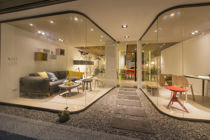 位於台北市的義大利家具專賣店---居雅堂,店內多以銷售色彩明亮、造型充滿設計感的義大利家具為主,因此希望藉由乾淨、清爽的空間,彰顯家具的特色,設計師特別打造除局部的灰色天花板外,觸目所及的牆面,皆施以白色,並搭配木材質格柵天花板,以及仿木紋的地磚,營造出自然清新與清簡舒朗的整體視覺效果。