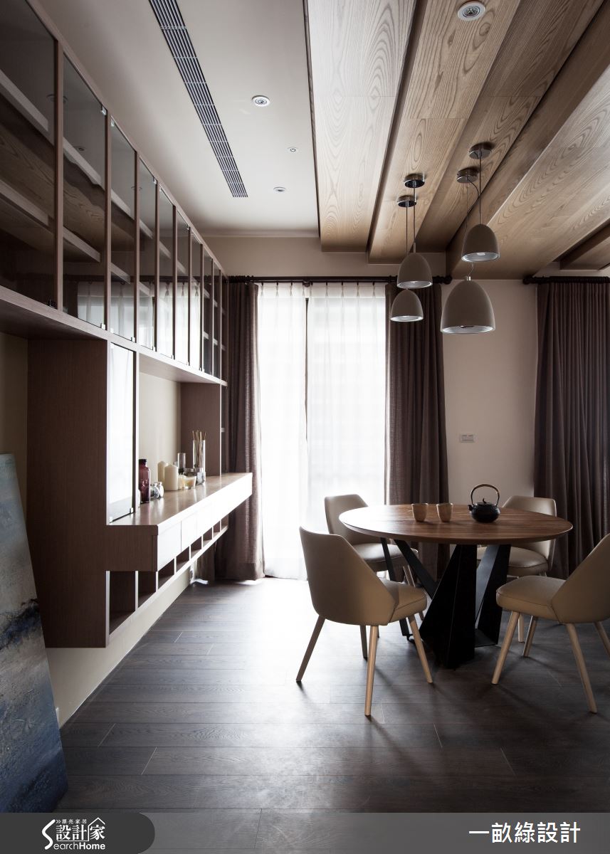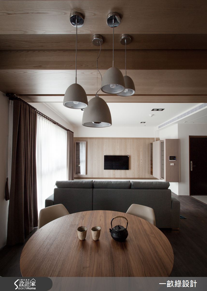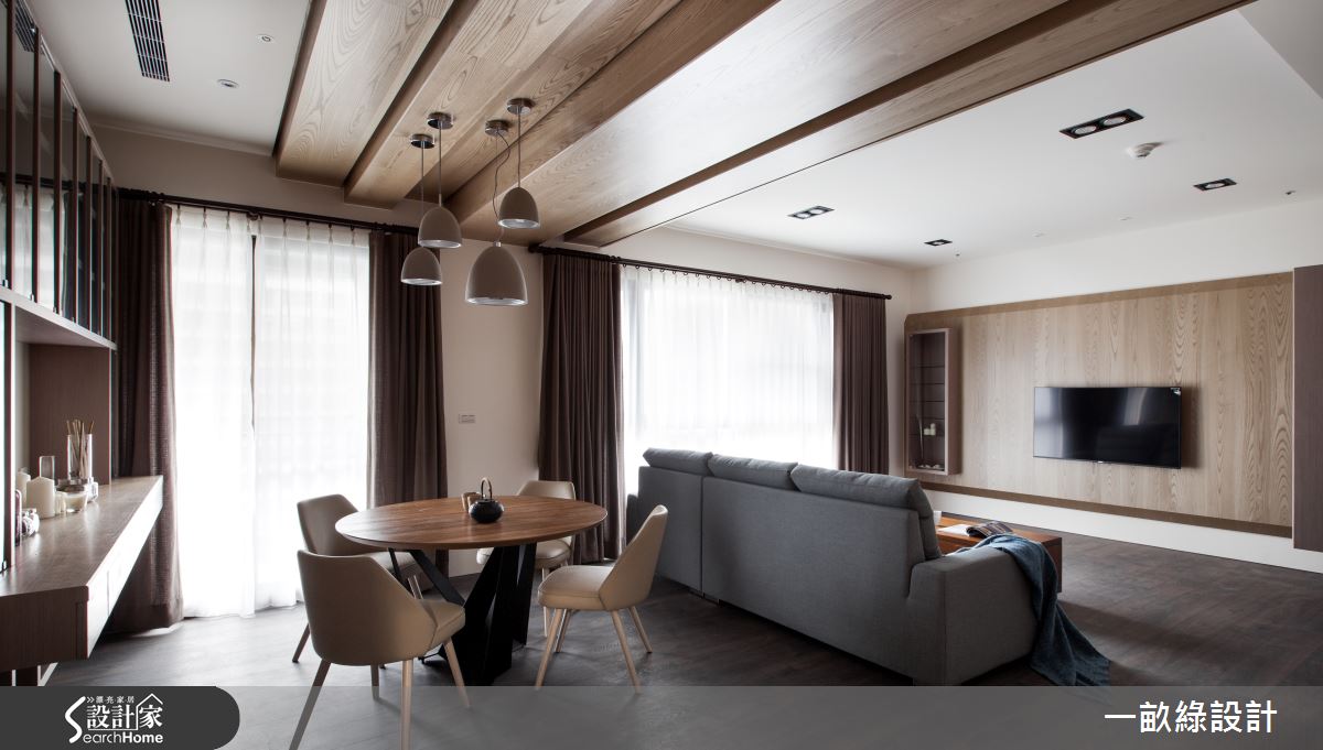 走進空間,設計師於玄關處設置衣帽櫃與儲物間,並給予透空木格柵設計,營造古樸雅致的入門畫面,同時配置懸空穿鞋椅,構成完整機能配置;公領域呈現寬廣格局,透過大量溫潤木質的鋪設,營造舒適親和力,天花則作出層次落差,消弭樑體的突兀感;並讓餐廳、客廳彼此連貫,型塑開放的互動場景,以圓桌象徵團圓,成就一處凝聚情感的重心場域,一旁則規劃餐櫃兼展示櫃,藉由懸空塊體的延伸鋪排,醞釀沉穩優雅的氛圍;寢臥則著重場域獨立性,兼具休憩、衛浴、更衣、梳妝等功能,給予齊全的生活機能,讓居者可保有適當、舒適的隱私空間!
