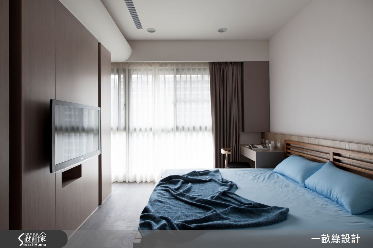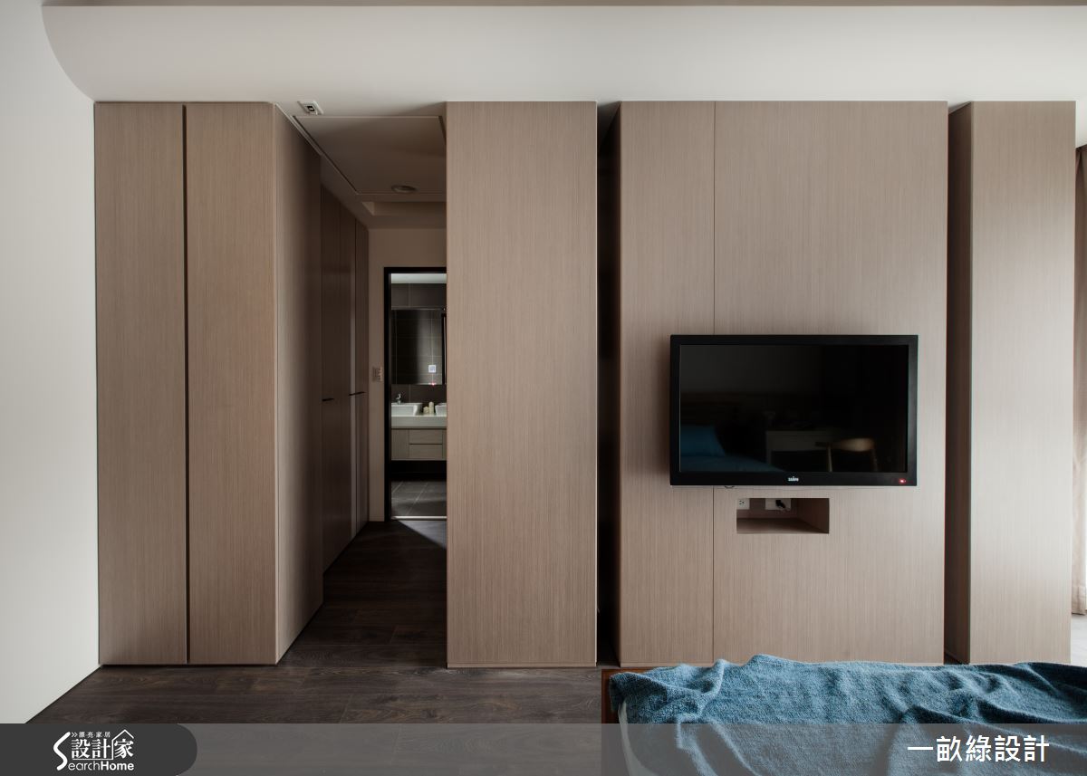 臥房內,巧妙將電視牆結合收納衣櫃,妥善利用每吋坪效,並讓櫃體建構進入衛浴、更衣間的導引動線,型塑流暢的起居脈絡!