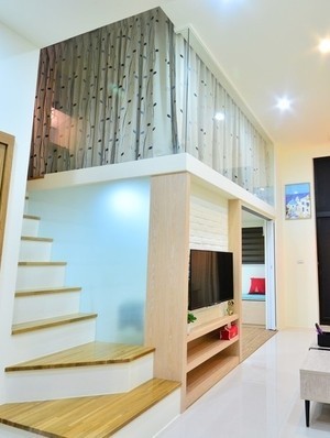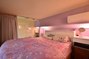 順著木質階梯拾級而上,由夢幻浪漫的粉色打造的主臥,則顯得更為優雅。房內也設有分離式空調,使玻璃房內的通風對流維持順暢,並加裝窗簾,保護女屋主的隱私空間。