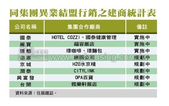 目前實施中的同一集團異業結盟建商,有國泰、遠雄、麗寶與璟都。國泰建設發行『國泰尊榮卡』,凡是購買新房子的客戶,就能獲得國泰集團旗下HOTEL COZZI的餐飲券、住宿券,以及持卡消費特定優惠。另外,已購客在期限內還能享有國泰健康管理服務,是目前唯一結合醫療服務的建商。麗寶則善用自家資源,先前曾推出賞屋送麗寶樂園門票方案,今年二月起,改推出民眾到特定建案完成賞屋程序,就能獲得福容飯店住宿五折券。這種促銷方案其實相當聰明,因樂園、飯店屬同集團公司,可以壓低促銷成本,又能有效增加來客量;即使來客多是專程來拿贈禮的無效客,最後還是會到樂園或飯店消費,對業者來說並不太虧。