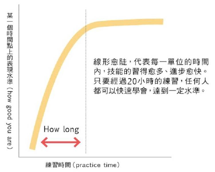 與學習曲線「當所學技能成長至一定水準,接下來學習成長的速度就會趨緩」的主張不同,陡峭的學習曲線代表神速的技能習得。如果你只是想要學習某一項新技能,夠用就好,不是要成為世界級卓越專家的話,那麼你需要應付的是學習曲線陡峭的部分。線形愈陡,代表每一單位的時間內,技能的習得愈多、進步愈快。只要經過20小時的練習,任何人都可以快速學會,達到一定水準。