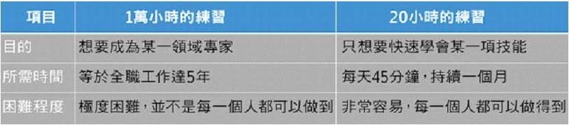 此外,在《異數》作者 麥爾坎‧葛拉威爾(Malcolm Gladwell) 「1 萬小時定律」的鼓吹下,讓許多人誤以為學習某一件事要花 1 萬小時,忽略了葛拉威爾所指的是成為專家的練習。對於只是出於興趣、好奇,想學新技能的人而言,學習的時間遠比想像中要來得少很多。