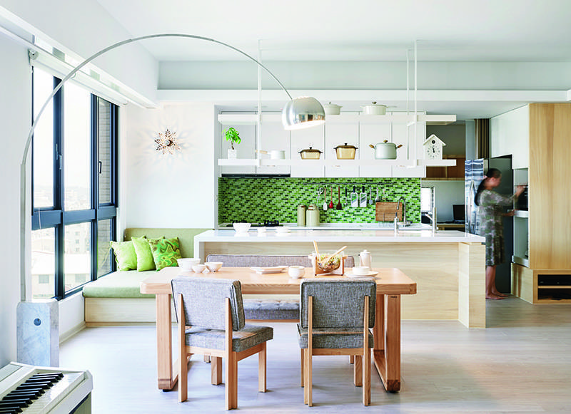 早餐Bar般的中島+側邊綠色方島=母子型中島「媽媽∼今天早餐吃什麼?那我的三明治要加小黃瓜……。」每個早晨,在這個50坪的房子裡,總是充滿著活力與溫馨。女屋主Rose語帶甜蜜地說,自從有了這座中島,家人開始養成一起圍在中島吃早餐的習慣,過往總是匆匆忙忙地吃早餐,現在小孩子對於早餐充滿期待,每當她在中島開始「動工」之際,就迫不及待前來察看一番,瞧瞧今天早上有什麼營養好料!
