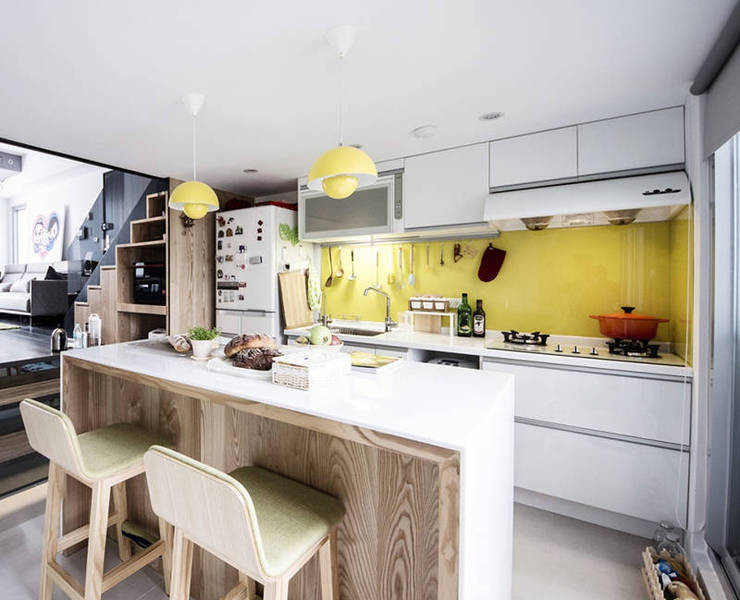 3坪的空間裡,餐檯結合儲物空間的中島,鄰近廚房內側作為收納抽屜,外側配合高腳椅作為用餐空間,一島多用。