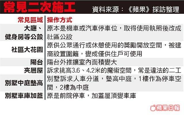二次施工則是預售屋常見的問題,當民眾看到華麗的大廳或社區獨享的超大庭院,可別高興太早,許多都是二次施工而來。齊太廣告協理謝俊正表示,有預售屋成屋後取得使用執照後,再施工將機車停車位改成氣派大廳,或將開放空間圍起,這些都是違建,經檢舉後面臨拆除的命運,對消費者來說徒增困擾。