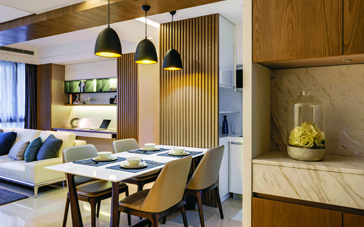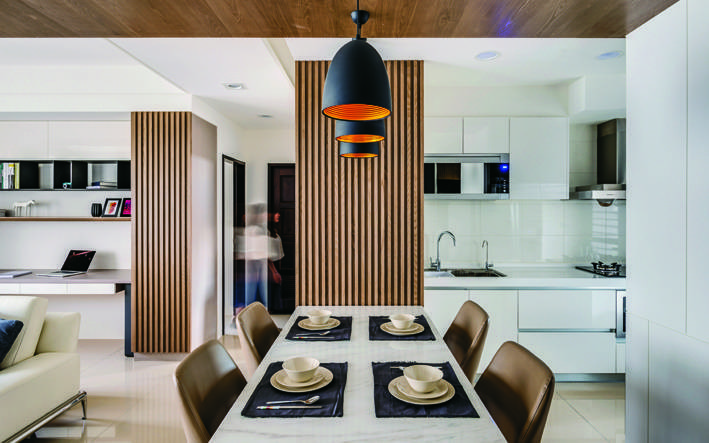 走出玄關即是餐廳區域,原先偏短的廚房工作區,因為冰箱挪走改造為多面用的機能高櫃,不僅能延長流理檯面,一些廚用小家電、食材、備品也能妥善安置,常保環境潔淨明亮,這座高櫃本身也兼具輔助餐桌定位的端景意義,設計師以直列木質格柵美化量體外觀,讓清雅的暖木色增添情境舒適度,而格柵線條也能與閱讀區對稱的高櫃造型相呼應,帶出相似元素起伏有致的視覺之美。