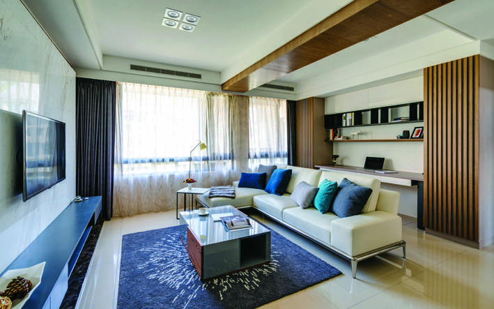 建商原始規劃的三房其實非常壓迫,跟屋主深入溝通之後,也納入未來五到十年間的階段變化,最終決定釋出一房,打開客廳受限的視野,實牆移除後;建物原有的結構橫樑隨之明顯,因此設計師善用局部天花板厚度,裝設必要空調、燈光等設備,橫貫在沙發上方的樑體則以木質分段包覆,隱喻客、餐廳與閱讀區之間,可共享也可各自獨立的機能分區。