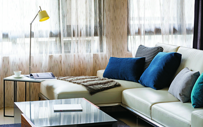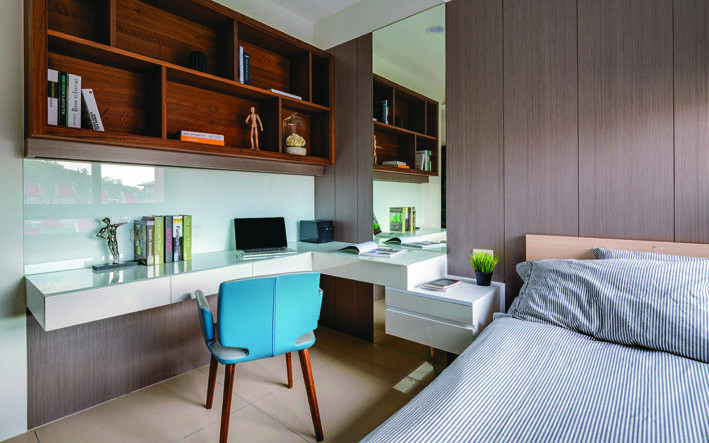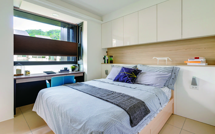 主臥室氣氛淨晰宜人,綠意盎然的窗邊是主臥室裡採光最佳處,適合規劃小巧閱讀區,設計師根據桌面高度封閉部份窗面,加上可隨機光控的機能型窗簾,保障臥室必要的隱私考量。客房同樣清麗舒適,床頭牆面以高雅木質底定悠閒氣氛,九十度轉角銜接的白色檯面,將閱讀桌、梳妝檯、床邊櫃等機能同步整合,牆面鑲嵌局部明鏡則能放大空間景深,隨處都是日常中的回甘片段。