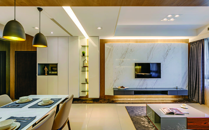 「進門不見灶」是國人住居上很普遍的基本規則,但此案因為空間不大,建商的廚房配置剛好與前述相抵觸,加上預留的餐廳動線也不理想,於是設計師挪動冰箱位置,並以雙面櫃的設計,同時完成冰箱安置與供玄關使用的展示兼收納櫃,化解進門見灶的疑慮,大門周邊牆面襯上馨暖木質,為接下來的客廳主牆連續面預留伏筆,玄關靠牆並以等比分割的灰鏡大面修飾,藉低調的光影反射,放大進門後的空間感,正面的玄關高櫃在造型上穿插大理石的潤澤,一方面滿足屋主對特定材質-大理石的喜愛,一方面也婉轉鋪陳全案前後呼應的風格語彙。