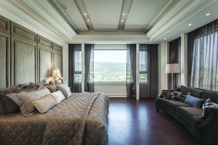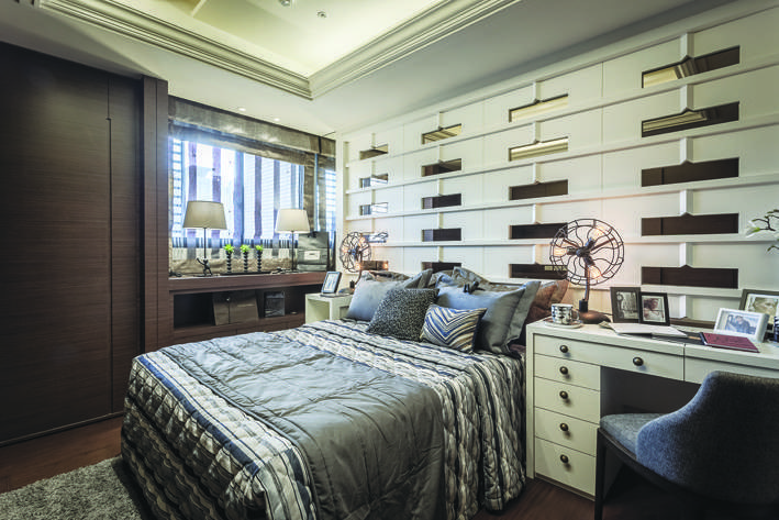 本案室內坪數廣達110坪,坐擁雙主臥的尊榮格局。大主臥室空間極為寬敞,進門後轉折的動線能各自通往睡眠區、更衣間和浴室,讓感情親密的夫妻也能保有自己的作息而互不干擾,室內主要以簡約的白為色彩基底,床頭牆面選用摩卡色絲絨,以繁複工序繃出精緻比例,兩側收弧線的包覆設計加上豐潤光澤,烘托過人的大面寬氣勢。次主臥延續前述的風情語彙,但床頭牆面改為活潑幾何的堆疊,為了增加睡眠時的安全感,特別在床側的陽台區增設木質拉門,床尾迎窗處則安排古典斗櫃,平整檯面最適合擺設賞心悅目的風情小物。