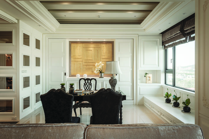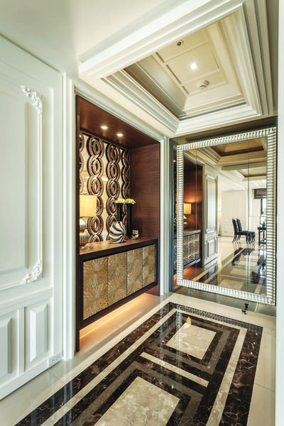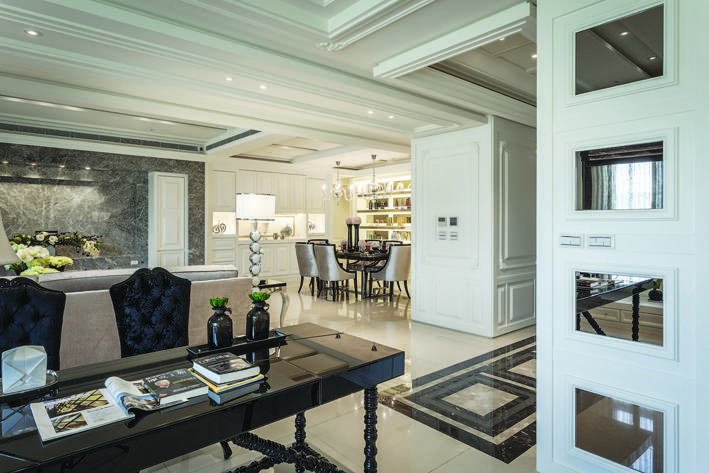 夏克設計對於新古典大宅的造詣功力早已是爐火純青,此案光是一進門的玄關區,就能看見許多高度講究的美學工藝,首先地面以多色大理石拼花,形塑橫向延展的方格圖案,宛如星光大大道上的迎賓紅毯,讓備受禮遇的尊榮感油然而生,正面端景以雷射雕刻而成的橢圓陣列搭配茶玻,下緣設置一座老師傅手工以金箔塗裝的玄關櫃,既是裝置藝術;也是巧妙屏障視線直貫餐廳的兩面用觀賞介質。