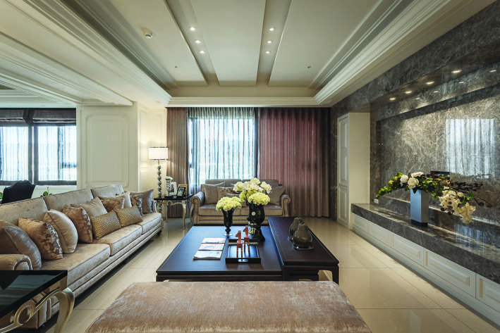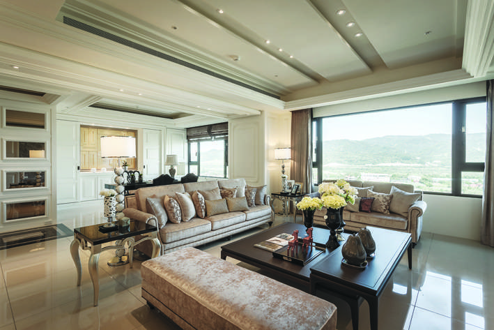 客廳大面開窗引入遠山天光,也因為開放書房擴張了景深更顯大器不凡,多層次的天花板以橫向燈帶豐富層次,顧盼間精緻度無所不在。廳內擺設皆以設計師手繪、量身訂製的家具為主,絲絨的光澤與形體的優美相輔相成,散發華貴知性的人文情懷。