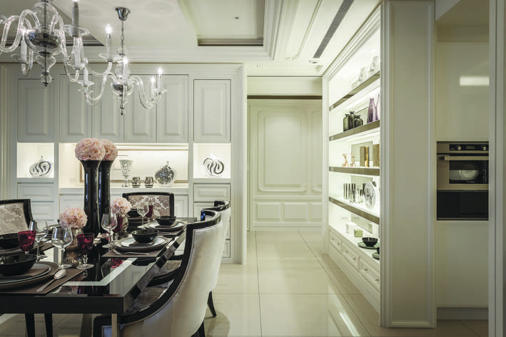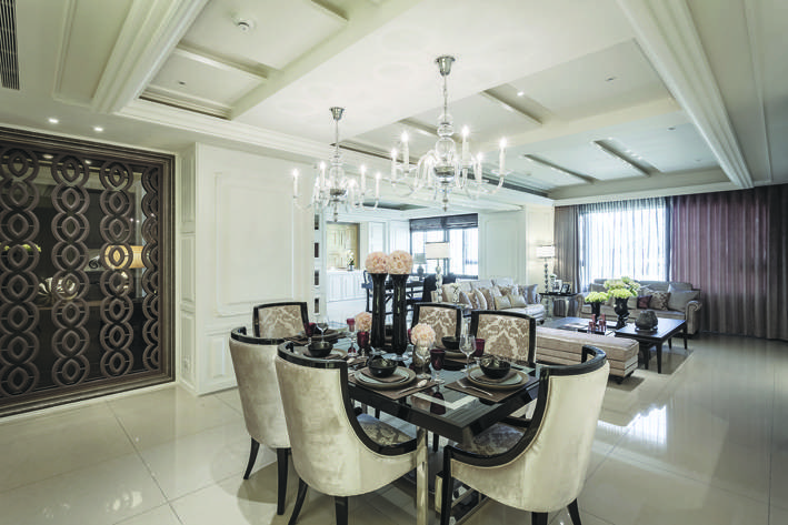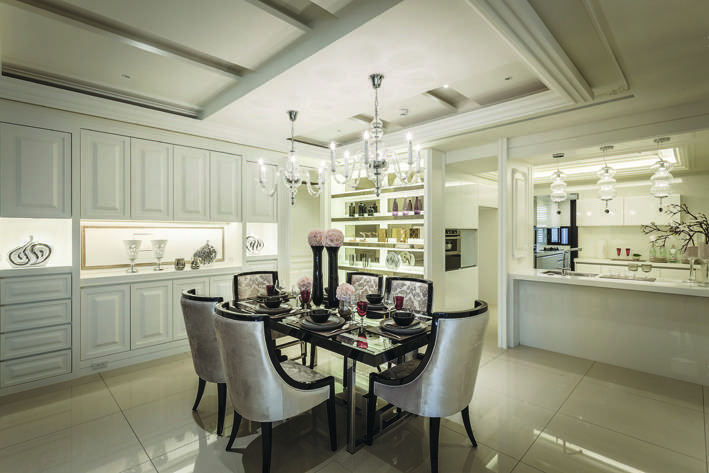 客廳、書房、餐廳間採互動性絕佳的開放規劃,彼此共享景深;也能保有個別的機能屬性,設計師透過活動家具擺設、機能櫃體與分區天花板造型微妙界定。光影繽紛的餐廳,猶如一闕高潮起伏的交響曲,兩盞水晶吊燈居中輔助餐桌定位,兩側分別是與玄關共用的茶玻屏風與大型古典餐櫃,攜手營造放大視覺縱深的積極效果,而原先封閉的廚房也改為開放式,光影可自由流動的工作檯面,讓廚房裡忙碌的女主人,能和餐廳或客廳內的家人輕鬆對話,享受彼此的陪伴,廚房內一色純白的高階設備完善齊全,隨時準備好提供使用者最棒的生活體驗!